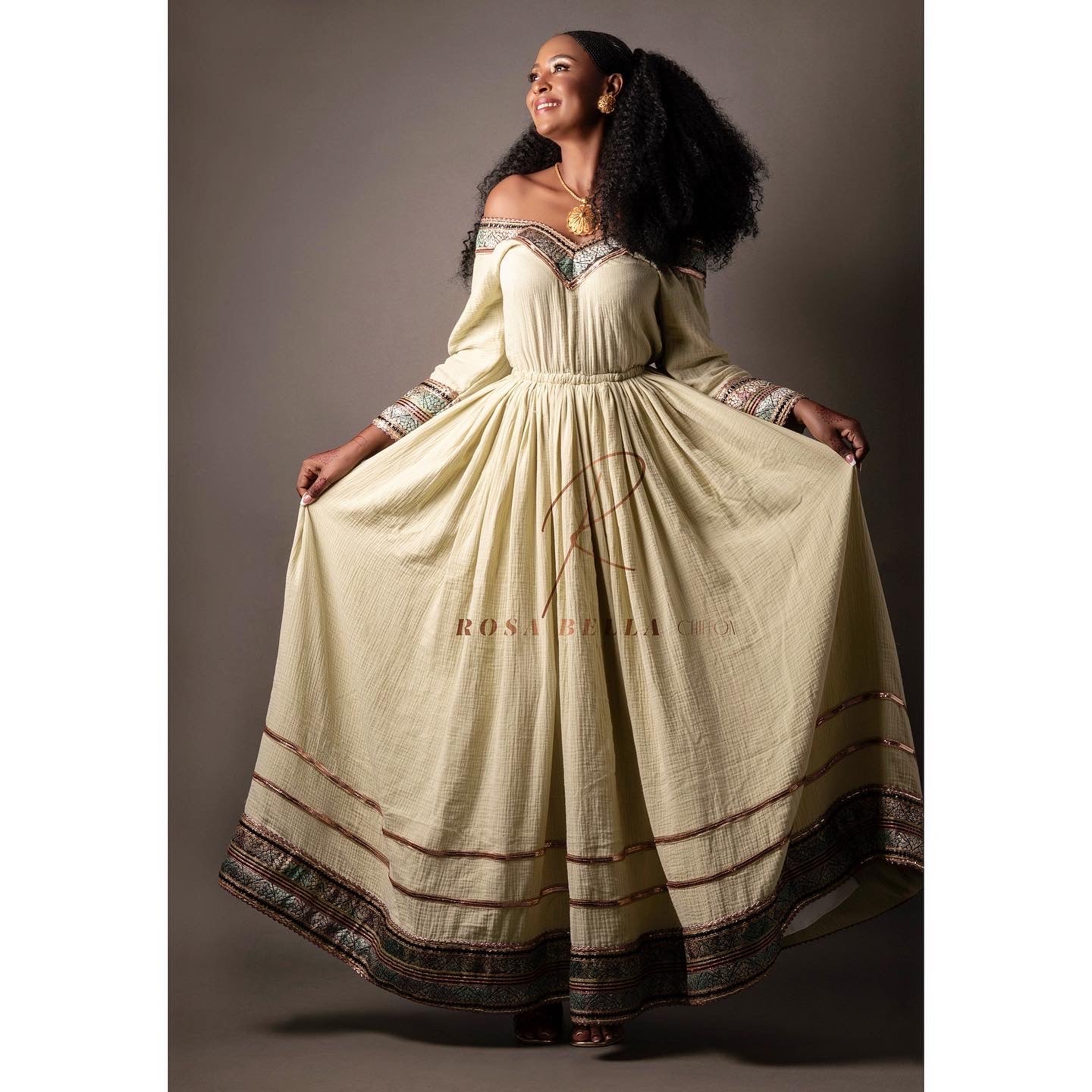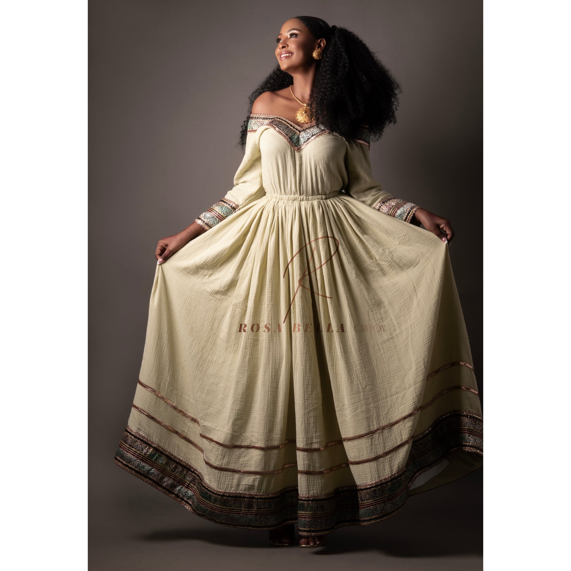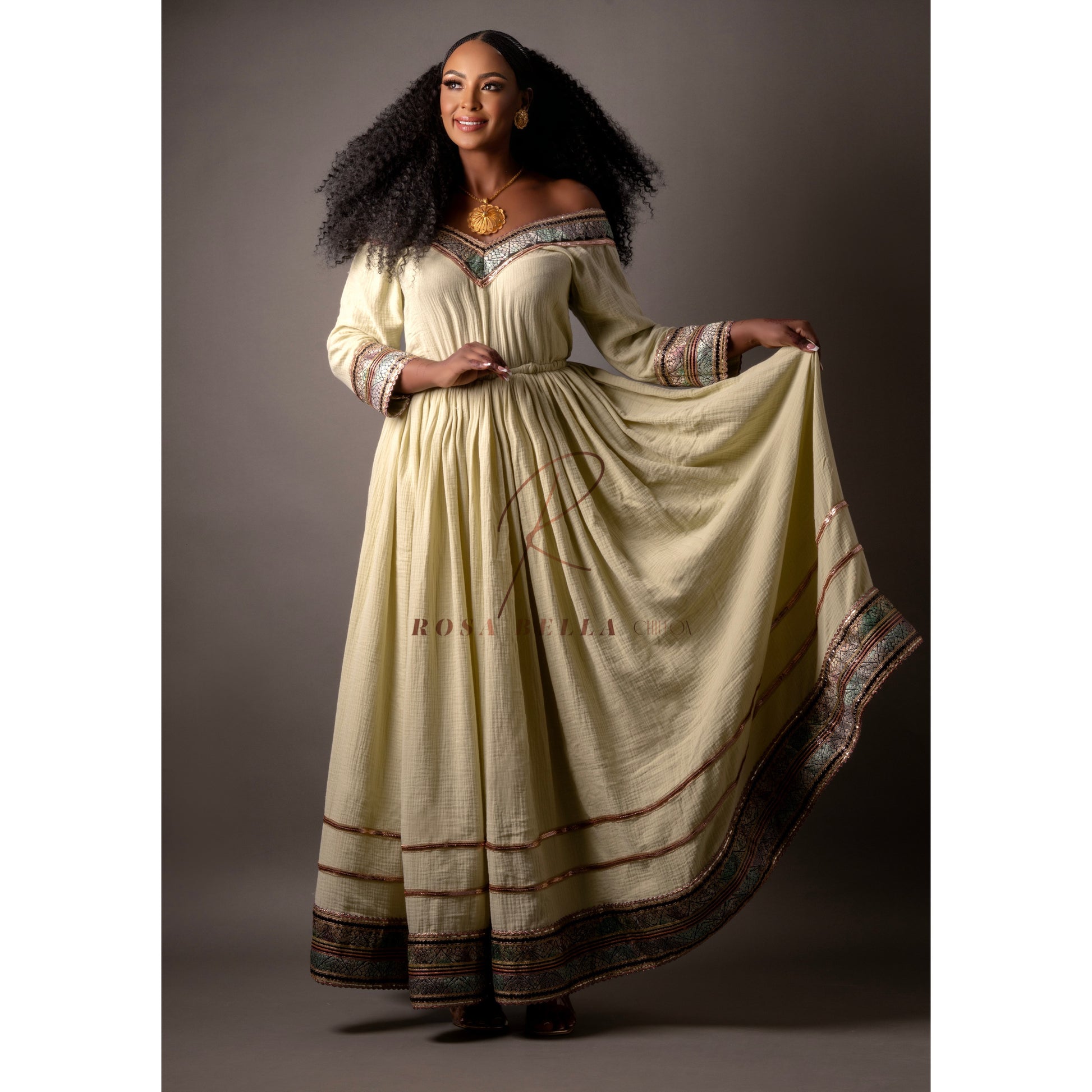 Abyssinia dress is a traditional Eritrean/Ethiopian design made of pure cotton fabric with beautiful embroidery and lace. The Abyssinia dress is absolutely perfect for any dream occasion.