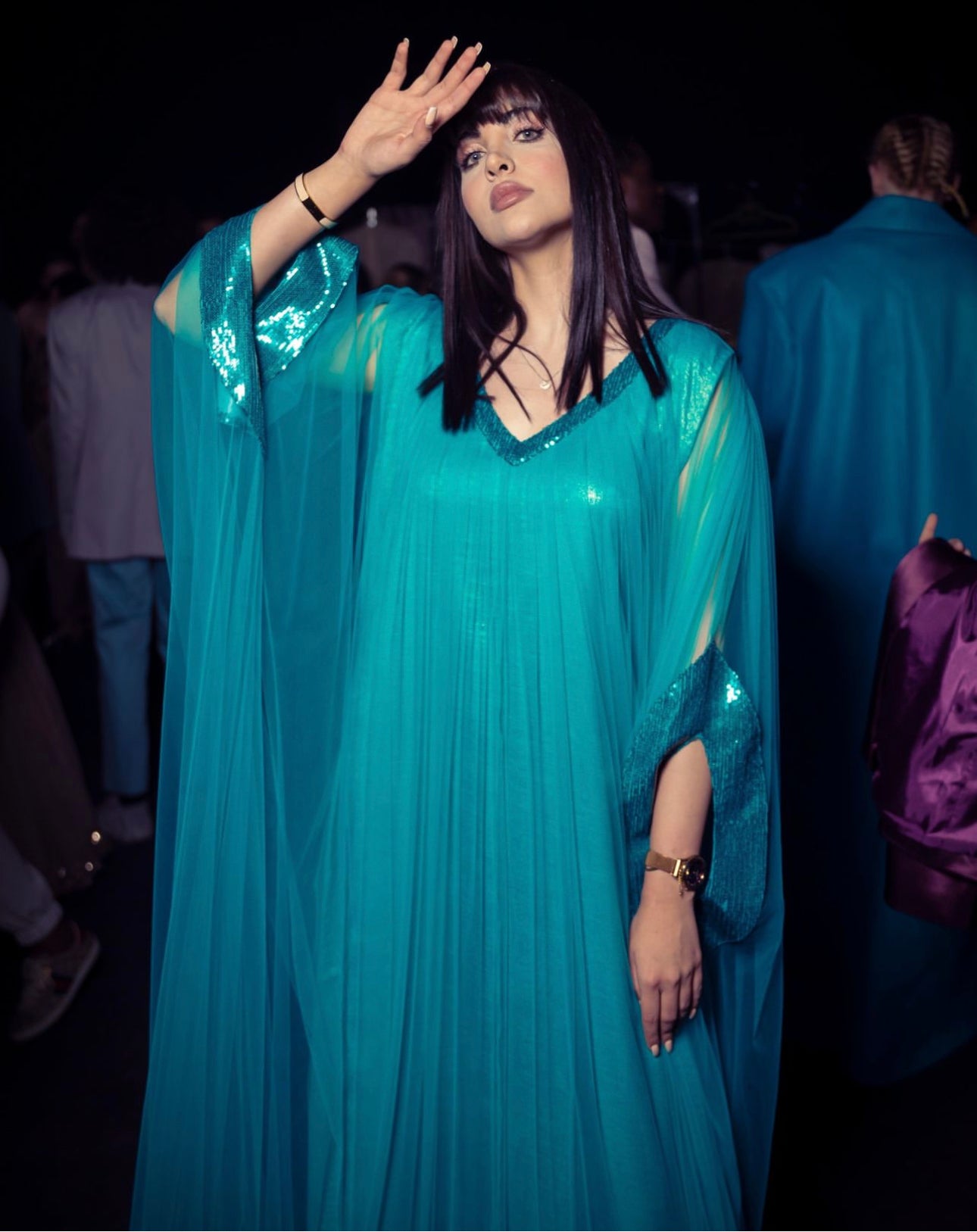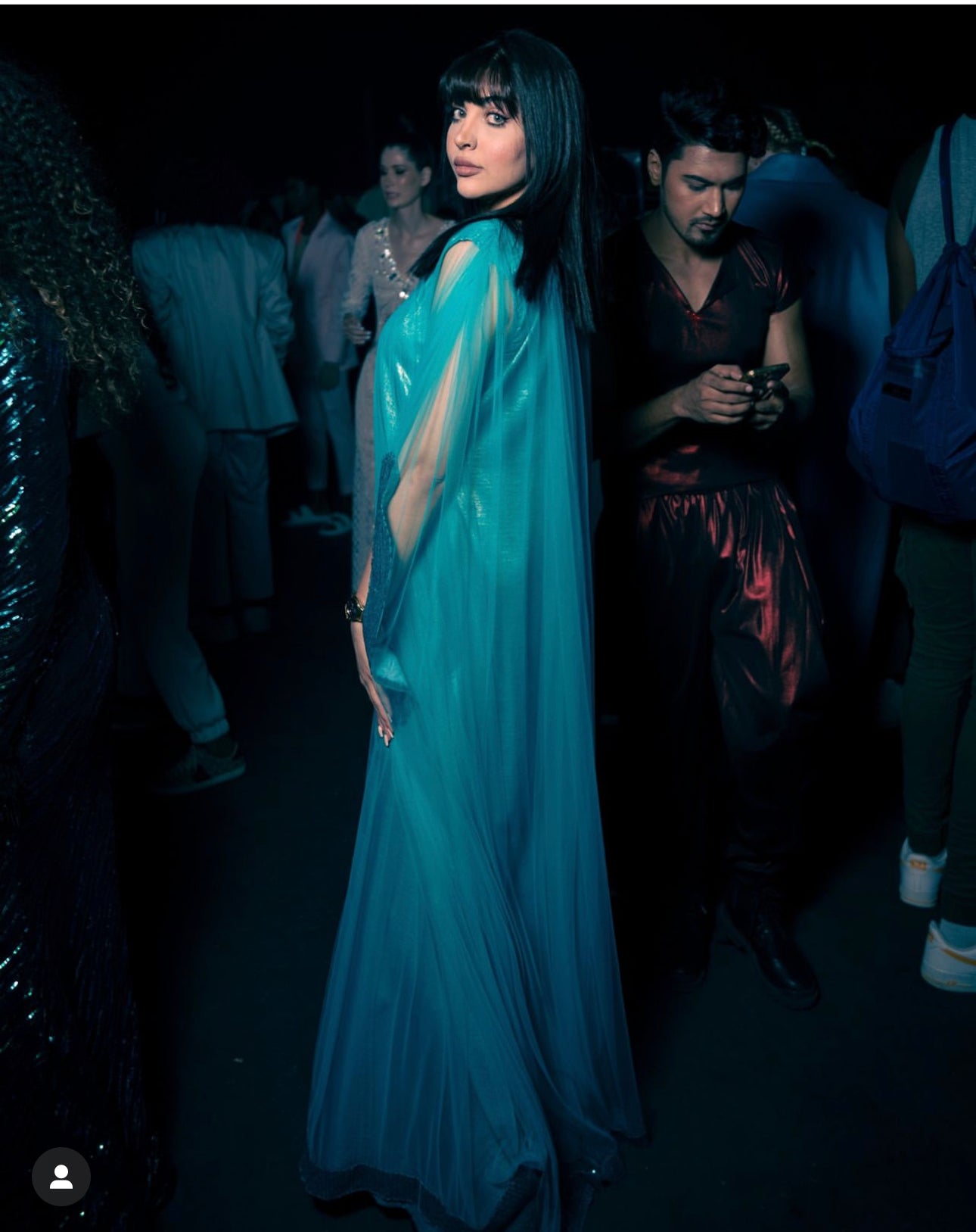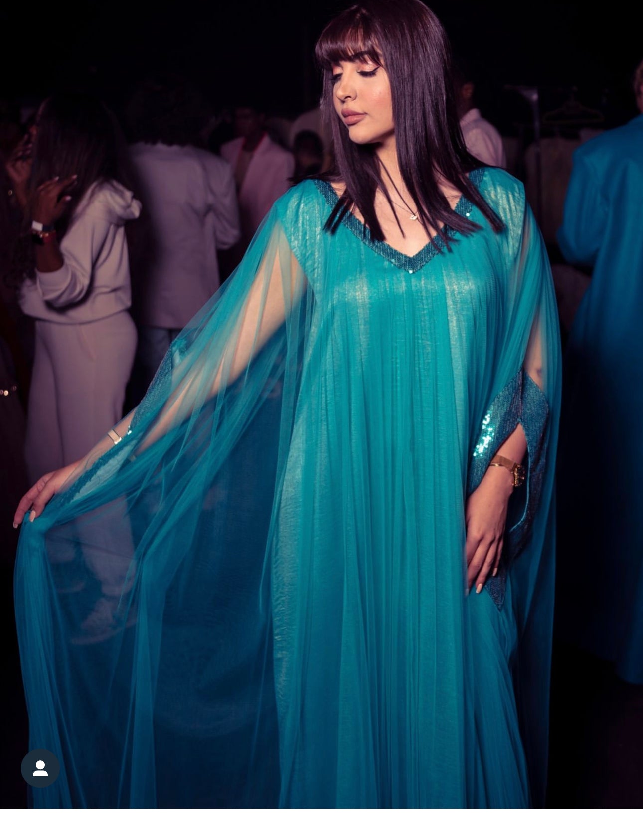The blue net fabric creates a semi-transparent effect, allowing a glimpse of the skin underneath while maintaining an air of elegance. The sequins are strategically placed throughout the dress, catching the light and creating a mesmerizing sparkle with every movement.