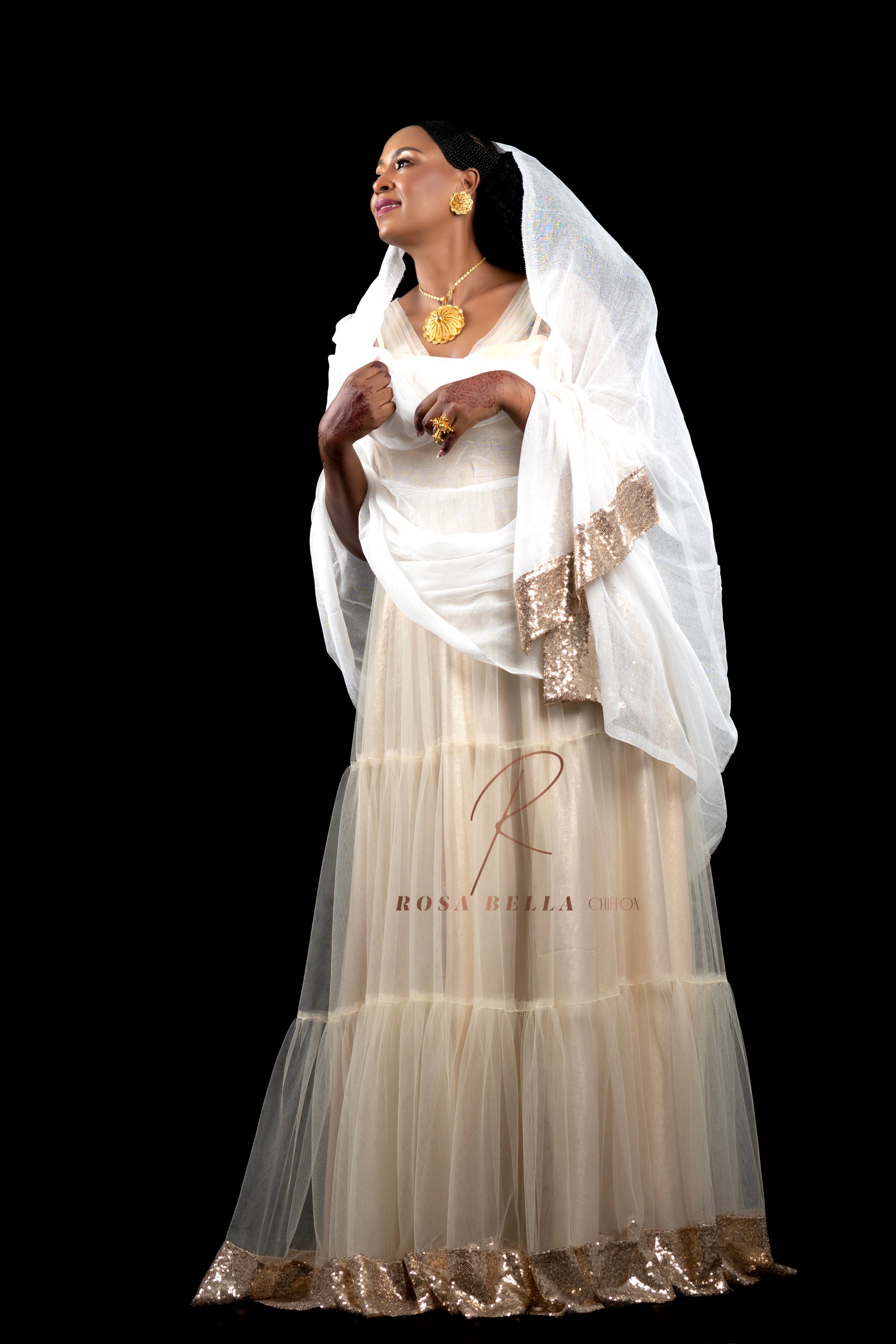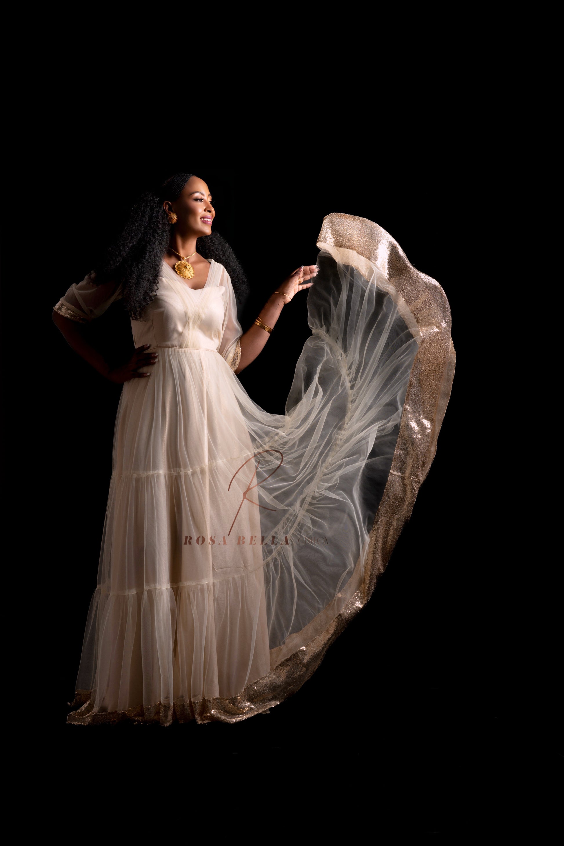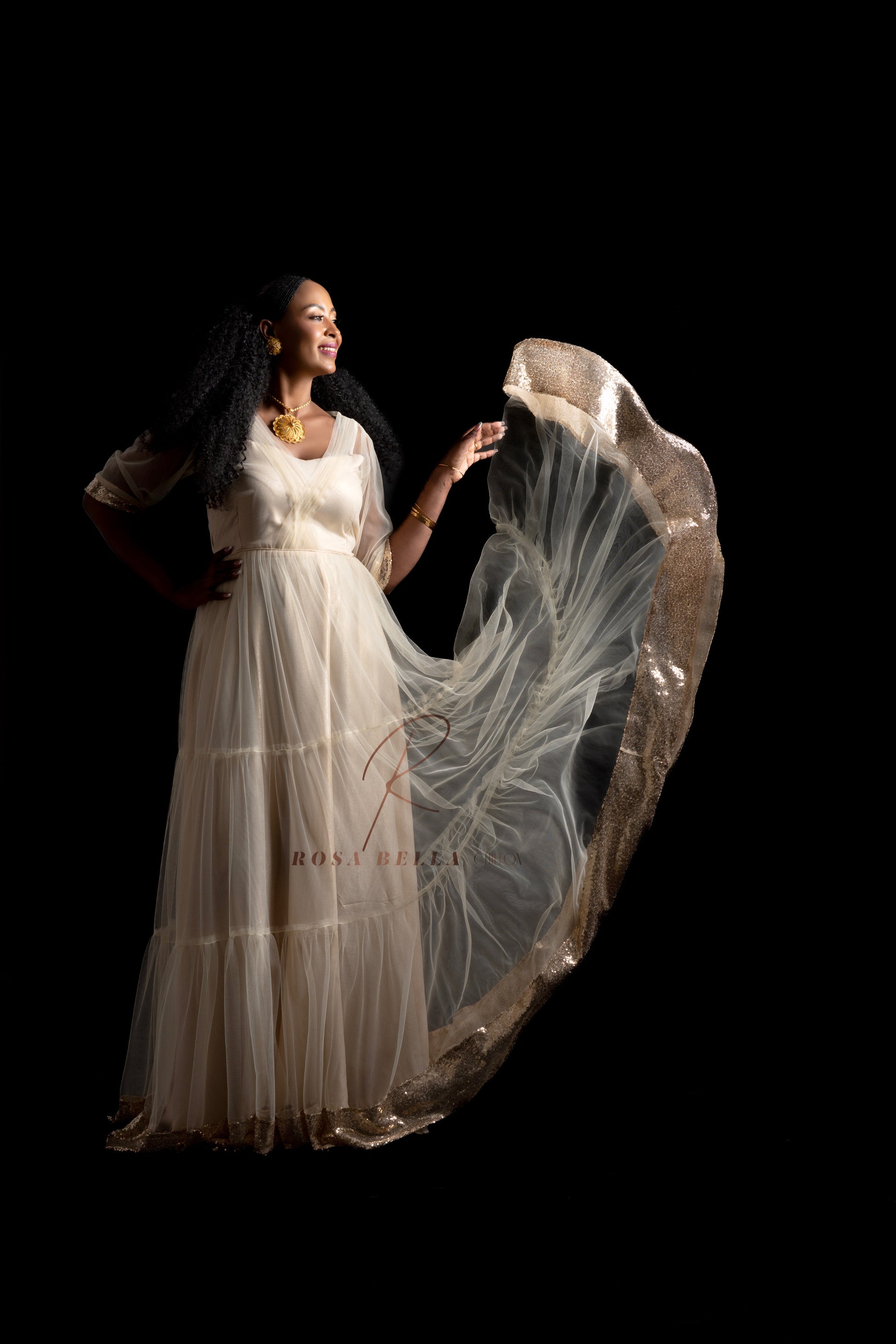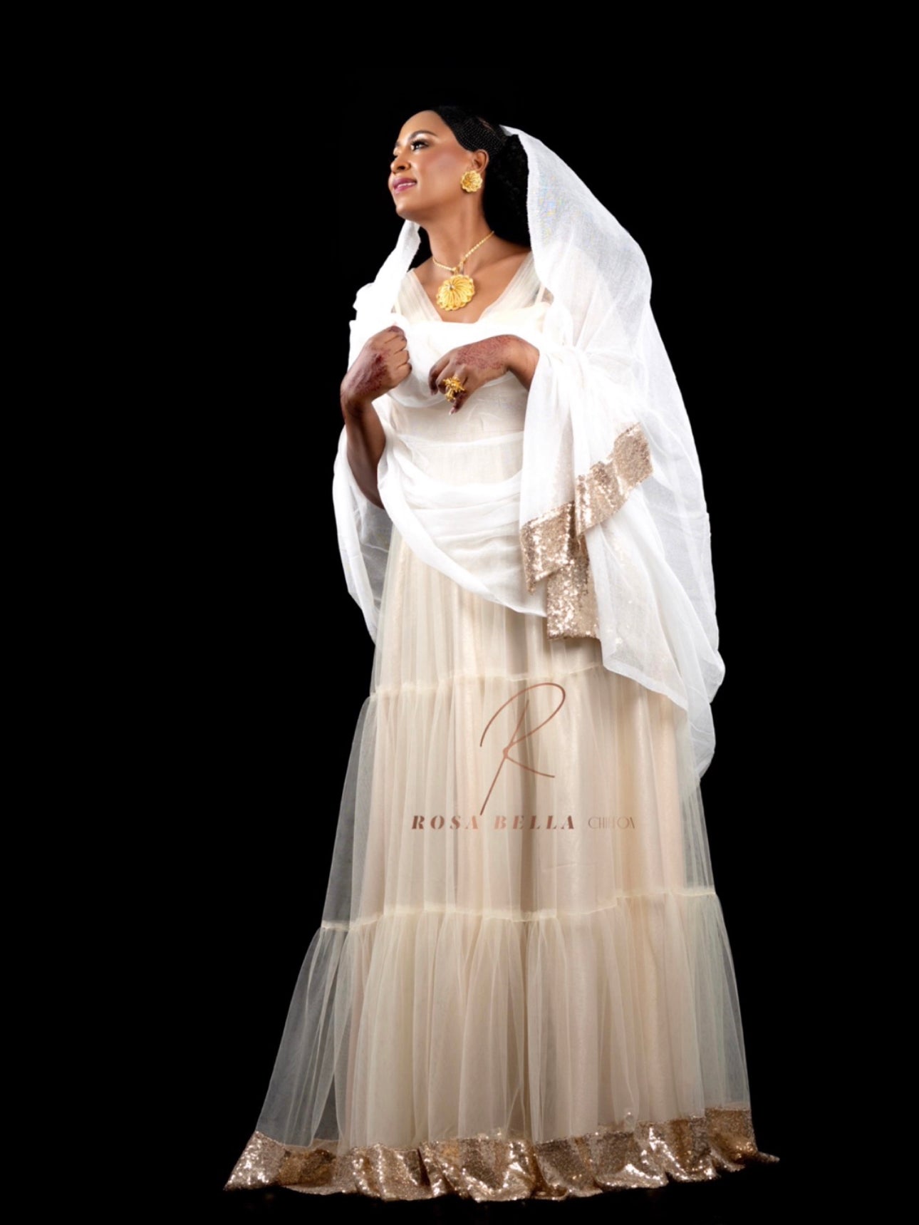 This stunning long dress features a captivating design crafted from delicate cream net fabric. The dress has a fitted bodice that accentuates the feminine silhouette, while the flowing skirt gracefully drapes down to the floor. The entire dress is embellished with shimmering sequins, adding a touch of glamour and enchantment.