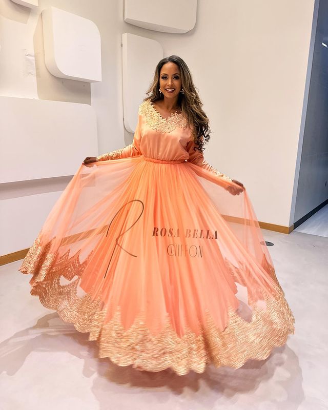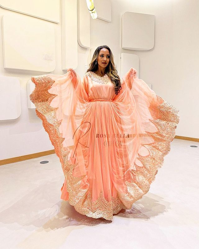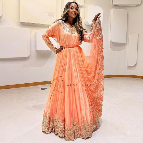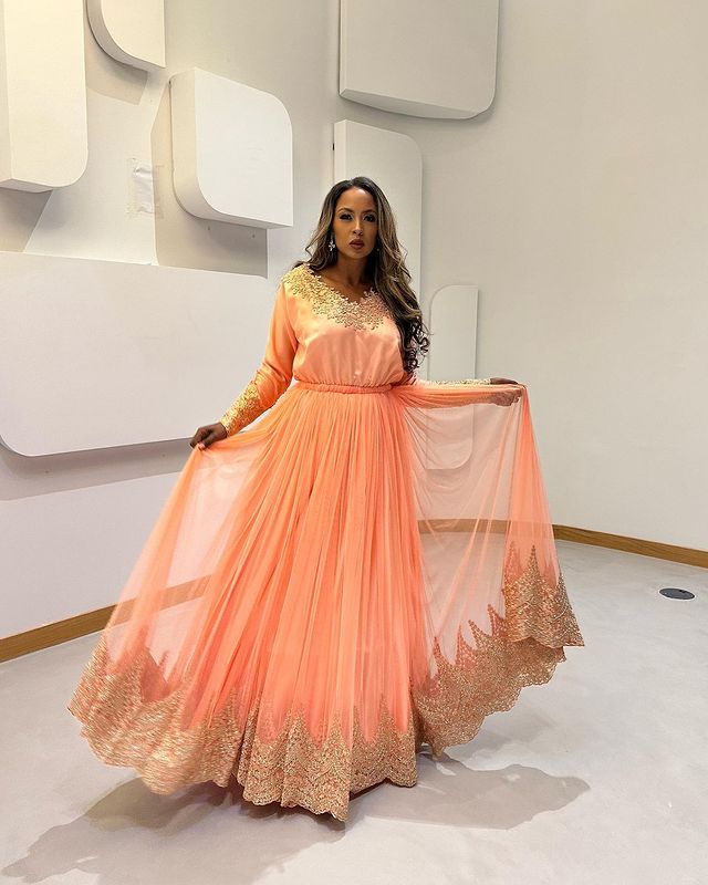 Impress your guest with the Kitara, a peachy coloured gown for any season. Kitara is made of net fabric that has been beautifully thread embroidered with golden lace for a modern twist. The lining is made of satin for that extra shine. Specially designed for any functiions. The actual finish gown may differ slightly in color and design based on custom order and measurements.