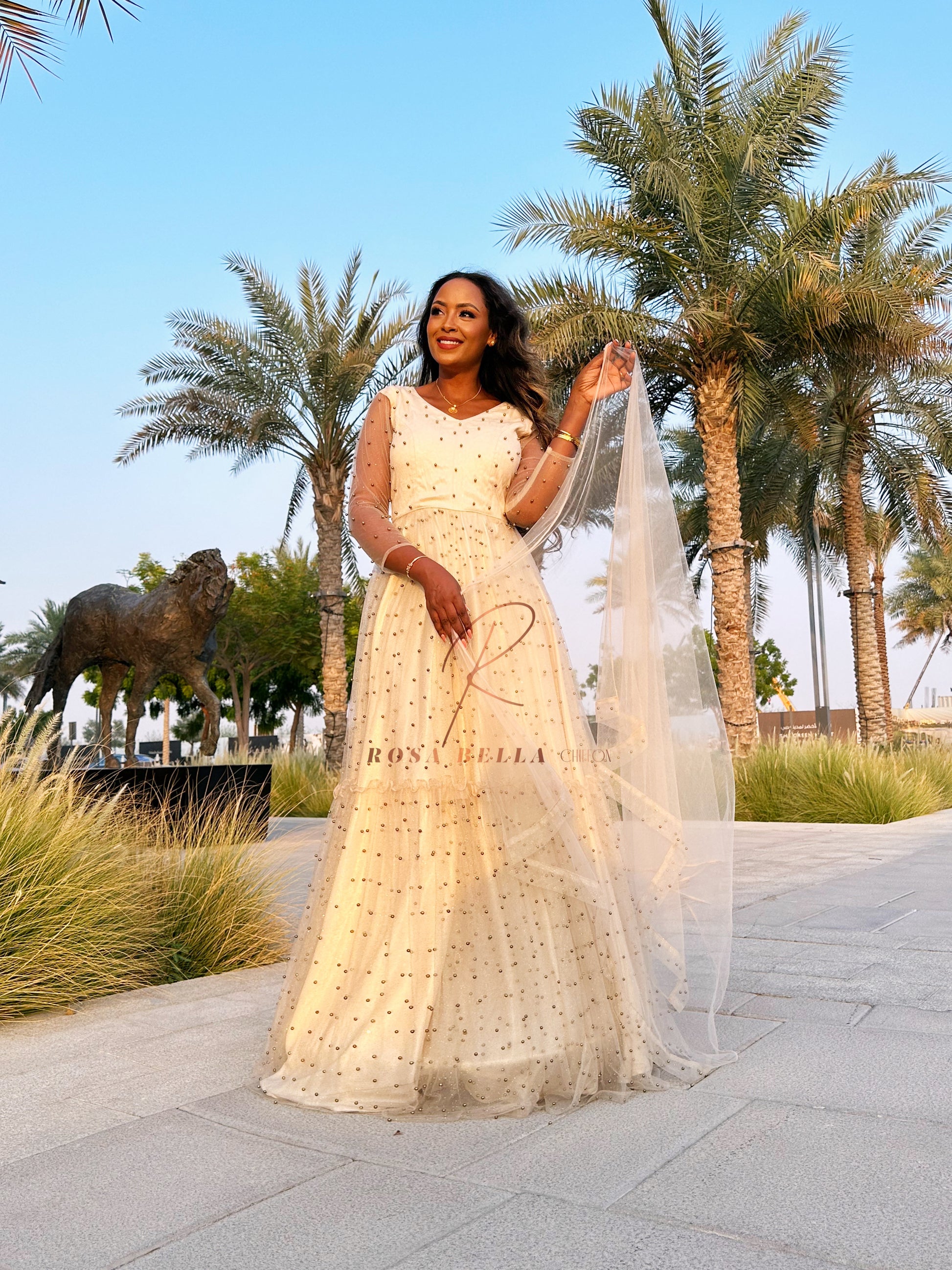 This stunning Cream dress embodies the essence of flowing silhouette. The dress is made from a lightweight net fabric, which adds an ethereal and semi-transparent effect, creating a sense of grace and sophistication.