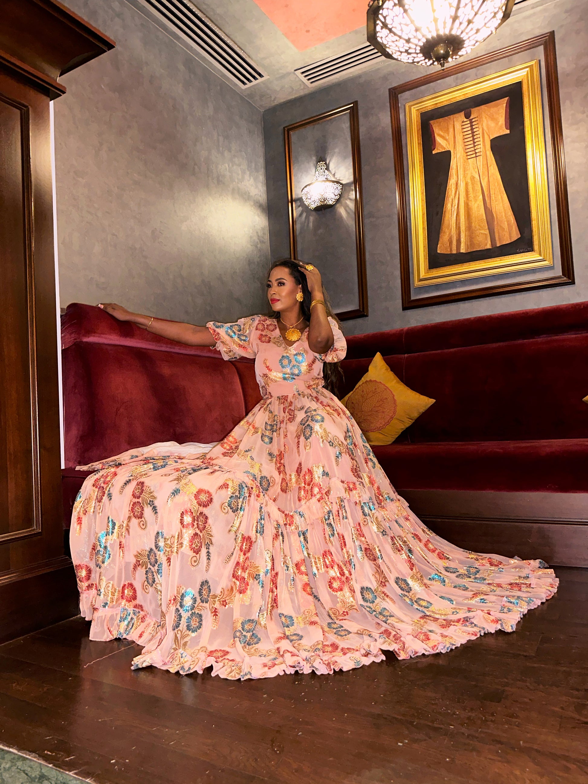 The dress is a classic and fresh maxi dress, accentuating the shape for the women, is made using chiffon material with buttercrepe for lining.