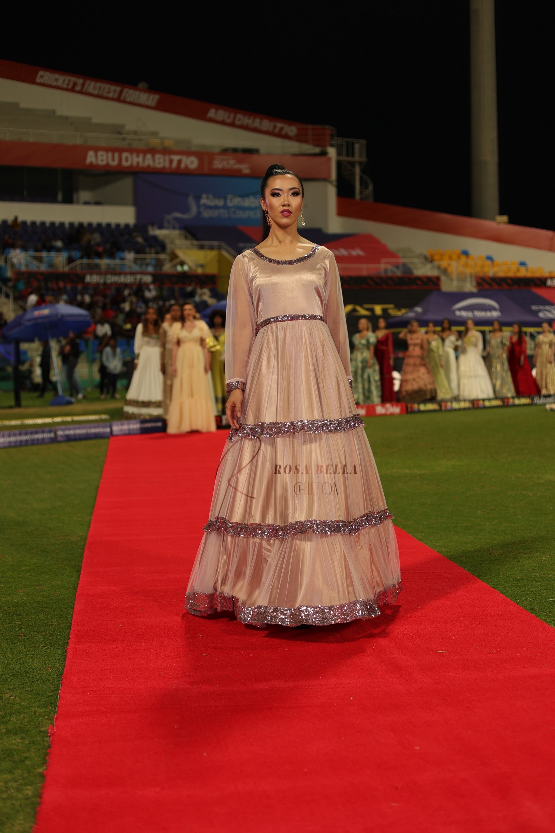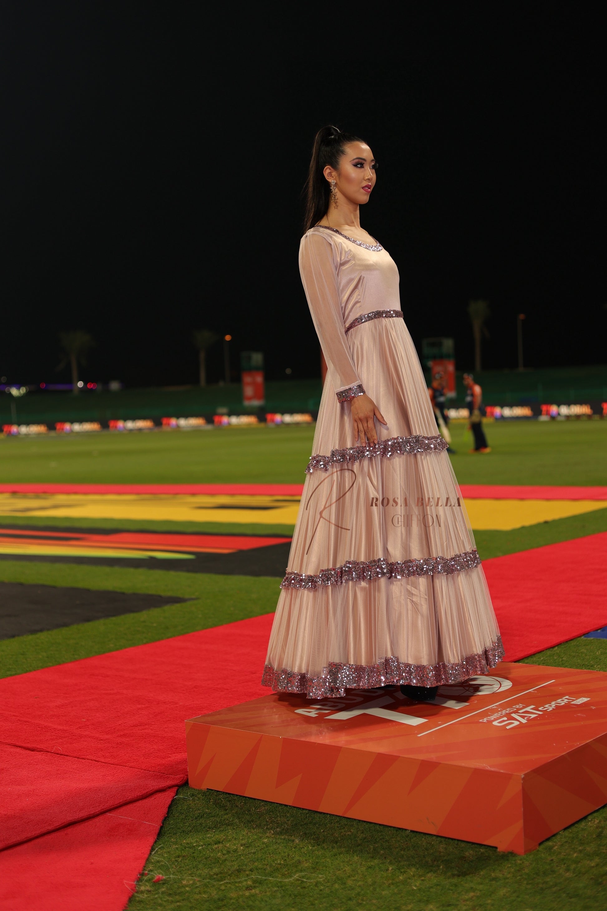 This stunning long dress features a captivating design crafted from delicate pink net fabric. The dress has a fitted bodice that accentuates the feminine silhouette, while the flowing skirt gracefully drapes down to the floor. The entire dress is embellished with shimmering sequins, adding a touch of glamour and enchantment.